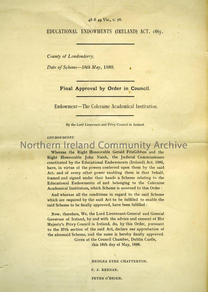 Booklet of Educational Endowments (Ireland) Act, 1885, held together with red string. 48 & 49 Vic., c.78. County of Londonderry. Date of Scheme 18th May, 1888. Endowment – The Coleraine Academical Institution. By the Lord Lieutenant and Privy in Ireland. (2148)