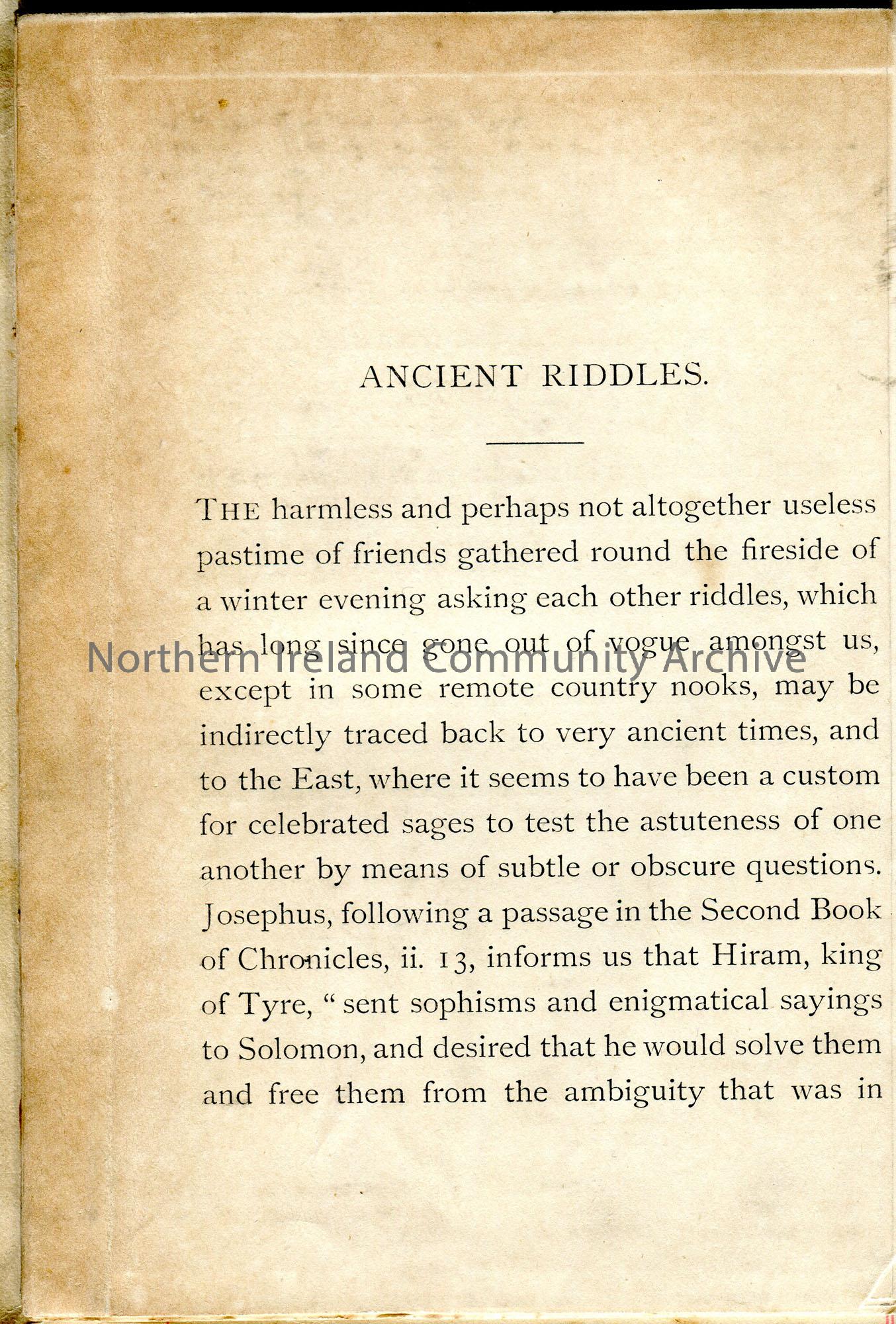 Booklet stuck to page titled, ‘Ancient Riddles’.