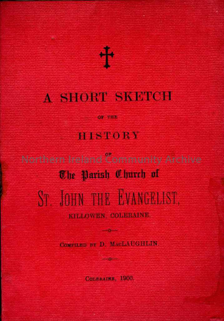 Booklet with a red cover, titled, 'A Short Sketch of the History of The Parish Church of St John the Evangelist, Killowen, Coleraine. Compiled by D. MacLaughlin, Coleraine 1900.