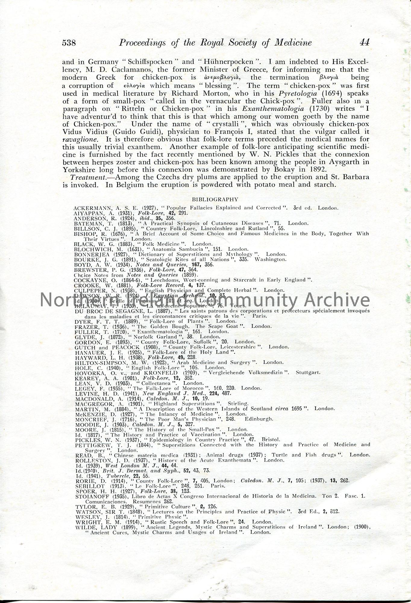 Booklet (with green cover, inside page detached) containing section from ‘Proceedings of the Royal Society of Medicine’. Titled, ‘The Folk-Lore of the… – scan034e
