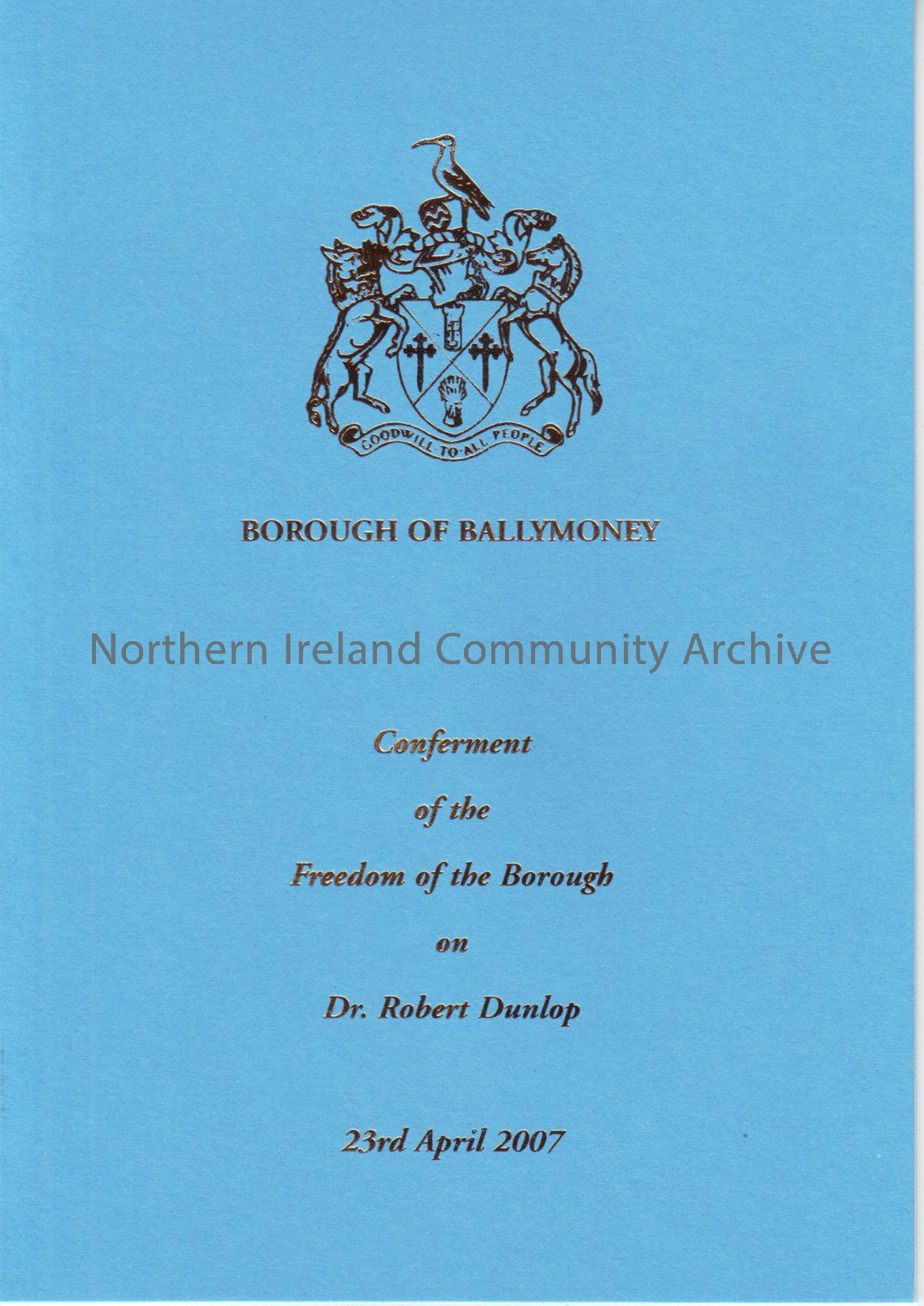 Borough of Ballymoney conferment of the Freedom of the Borough on Dr. Robert Dunlop 23rd April 2007. Civic Luncheon following freedom ceremony programme.