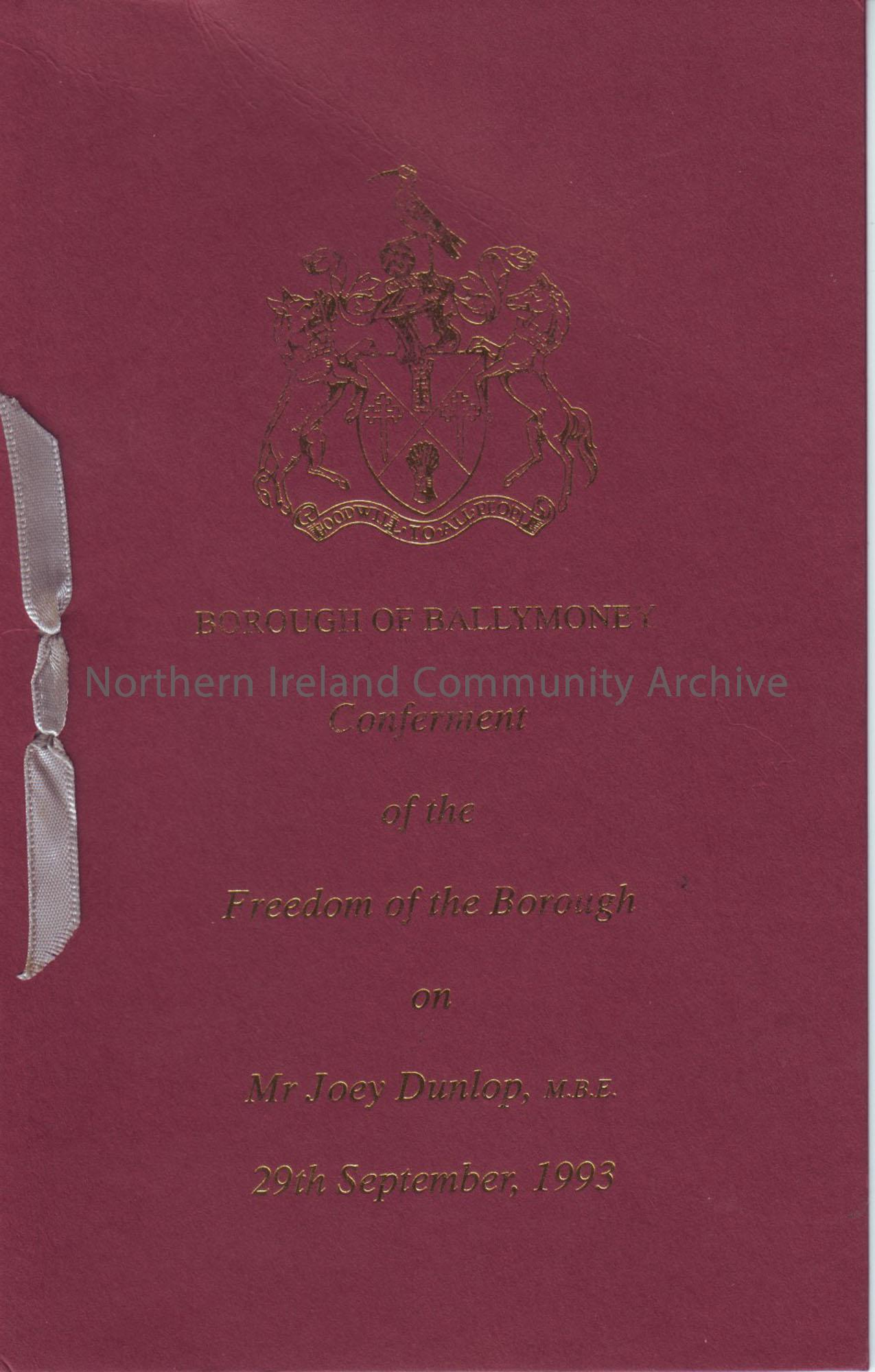 Borough of Ballymoney conferment of the Freedom of the Borough on Mr Joey Dunlop, M.B.E 29th September, 1993 programme and civic dinner menus.