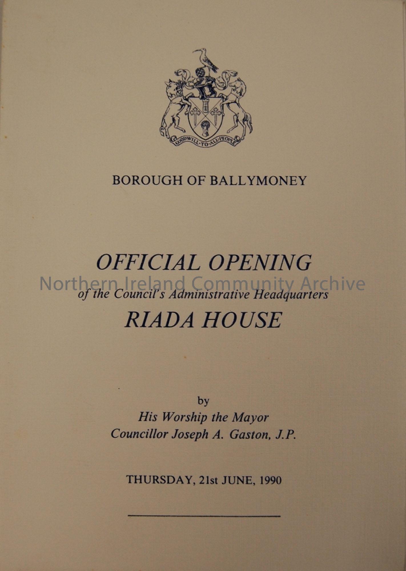 Borough of Ballymoney Official opening of the Council's Administrative Headquarters Riada House Menu. Thursday, 21st June, 1990.