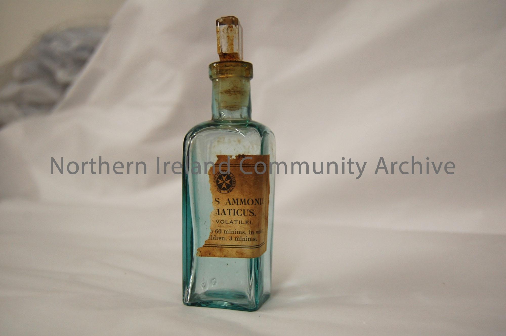 bottle, blue tinted glass, label torn “ammoniae…” (St.John Ambulance)