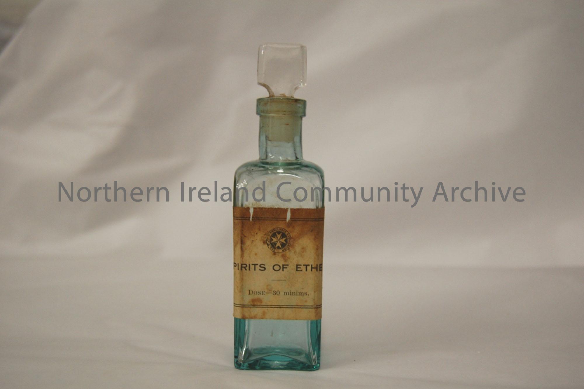 bottle, blue tinted glass, “Spirits of ether…” (St.John Ambulance)