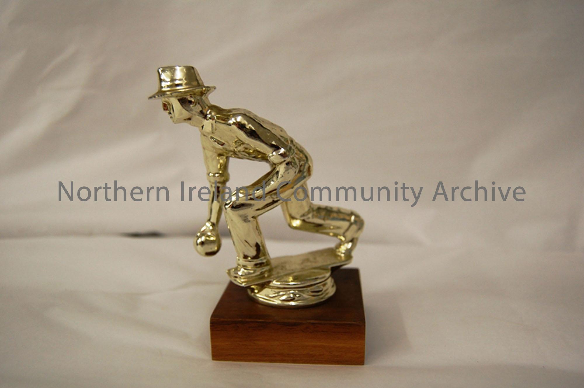 Bowling trophy- brass statue of a man bowling mounted on a wooden plinth