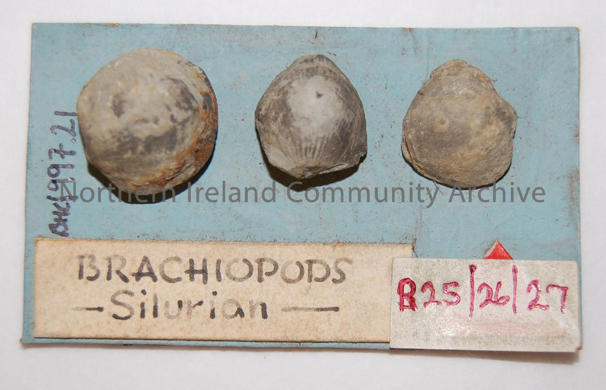 brachiopods, small, grey, stuck to mounting card