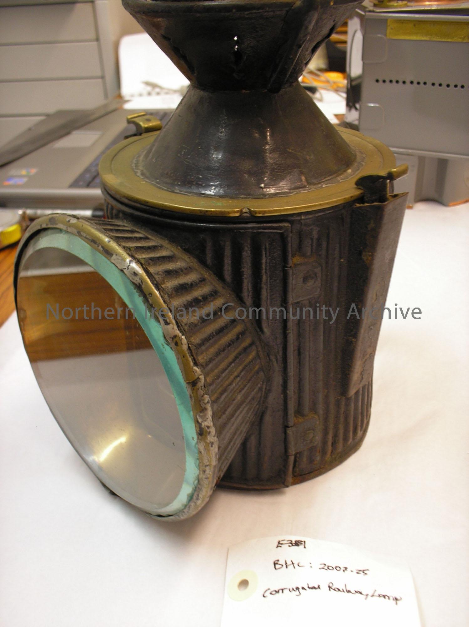 brass railway lamp with corrugated edges and fluted top, glass intact. Brass plate with inscription ‘Messengers Patent Corrugated Lamp’
