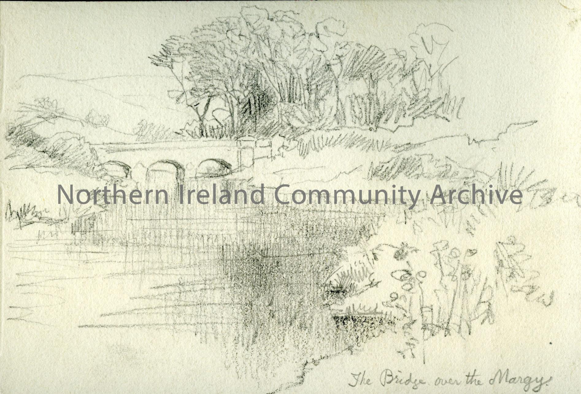 drawing titled 'Bridge over the Margy on Glenshesk at Ballycastle' by Hugh Thomson for 'Highways and Byways in Donegal and Antrim' by Stephen Gwynn. Possibly for page 249 in book