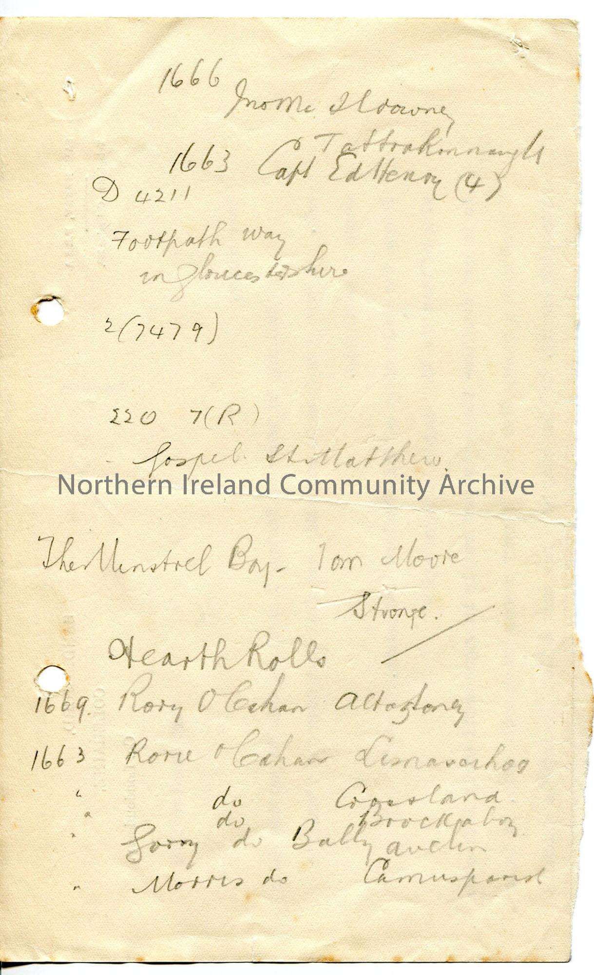Brief handwritten notes with 17th century dates – hearth rolls, names. Written on reverse of half a letter to a ‘Harry’ re songs collected and stories…