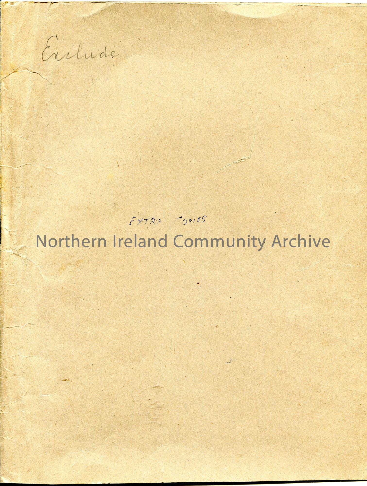 Brown card folder labelled ‘Extra Copies’. ‘Exclude’ handwritten in pencil top half of folder.