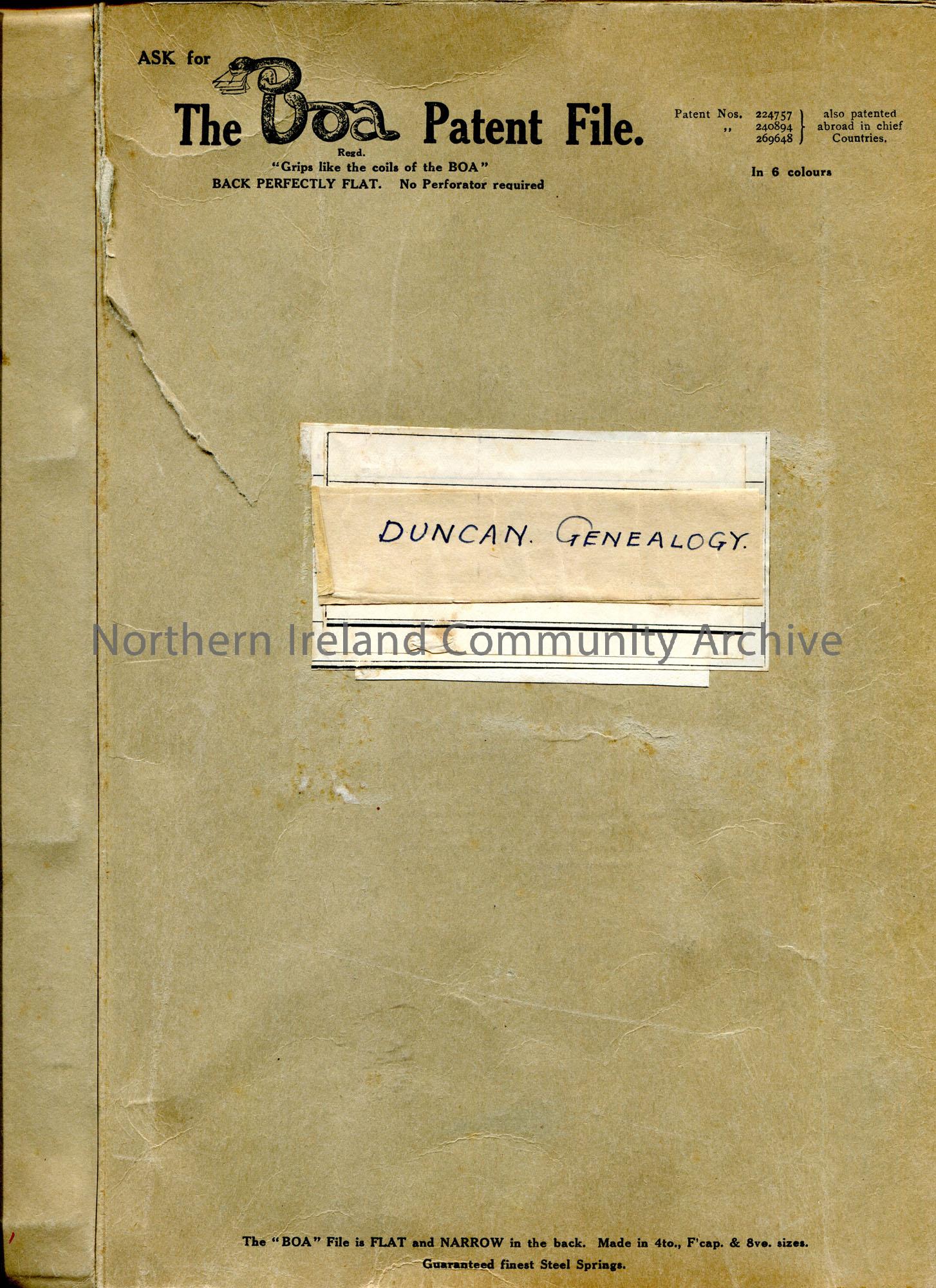 Brown colour ‘Boa Patent File’ labelled ‘Duncan Genealogy’ on front cover.