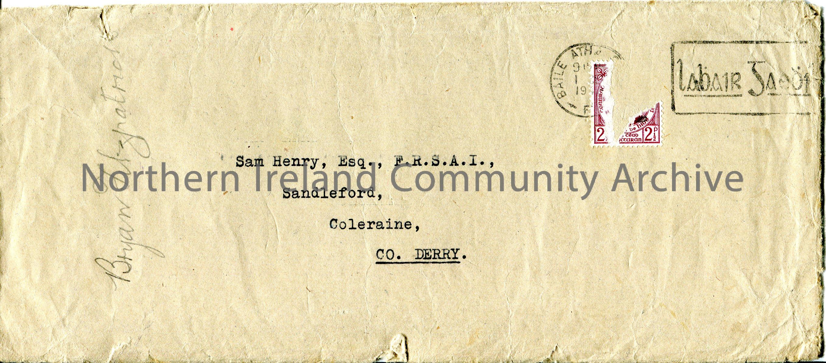 Brown envelop addressed to Sam Henry, Esq., F.R.S.A.I., Sandleford [Sandelford], Coleraine, Co. Derry. The name 'Bryan Fitzpatrick' handwritten in pencil on left side of envelope.