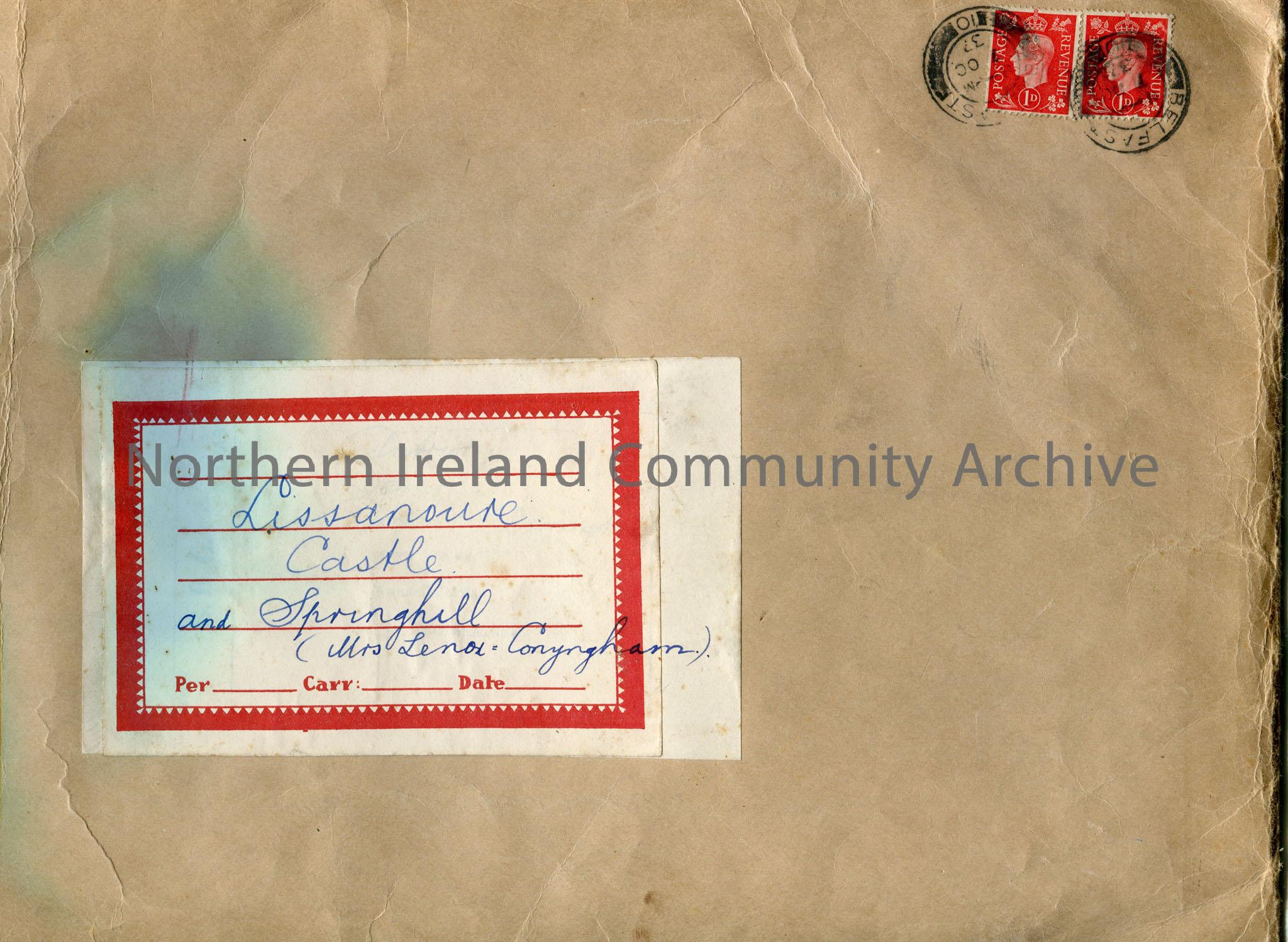 Brown envelope labelled 'Lissanoure Castle and Springhill (Mrs Lenox = Conyngham). Two red postage stamps of King George VI on front of envelope along with two date stamps of Belfast 7th October, 1937.