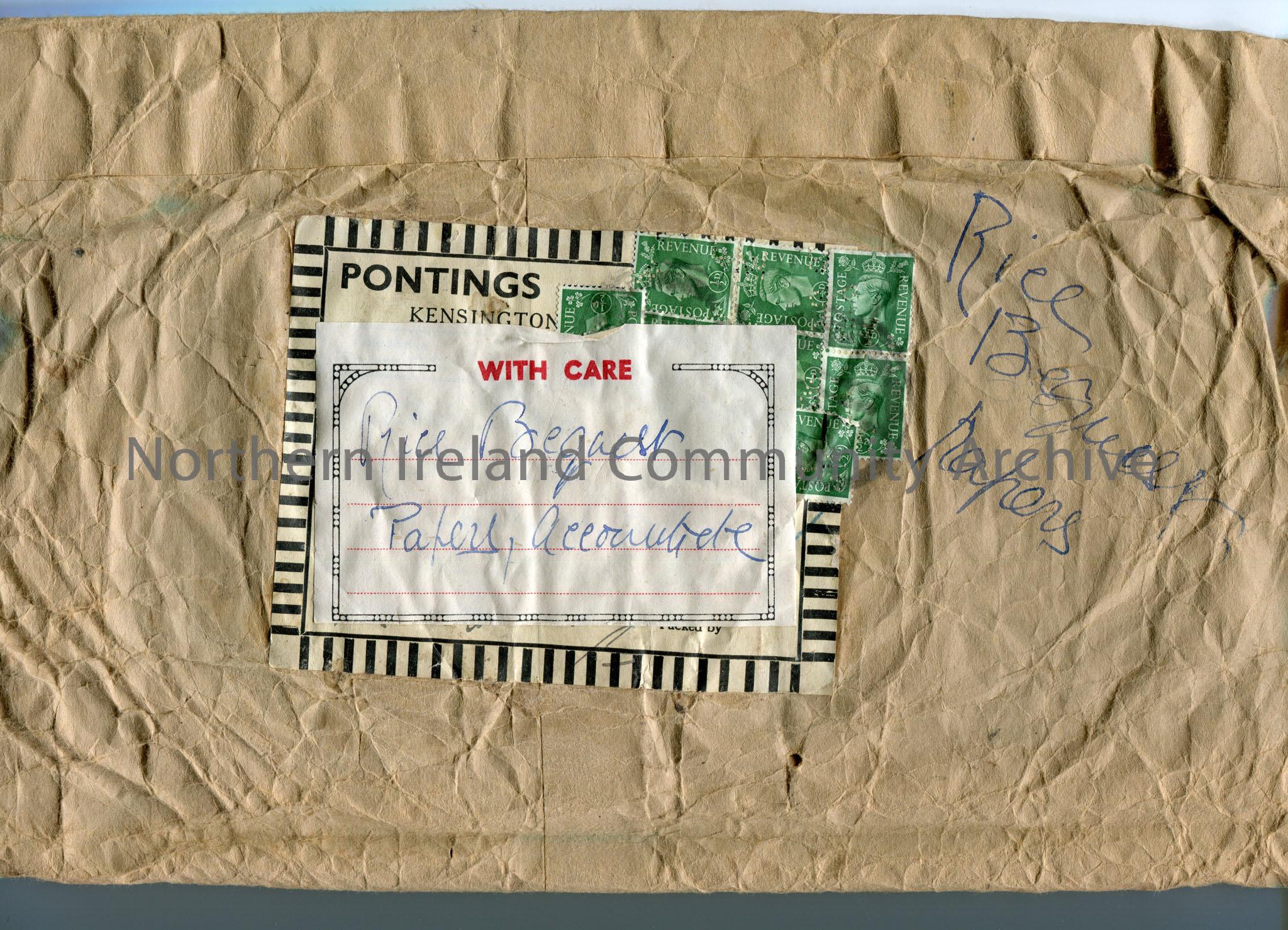Brown envelope labelled Rice Bequest Papers. Eight green postage stamps of George VI on envelope under label. Pontings Kensington on original black and white label.