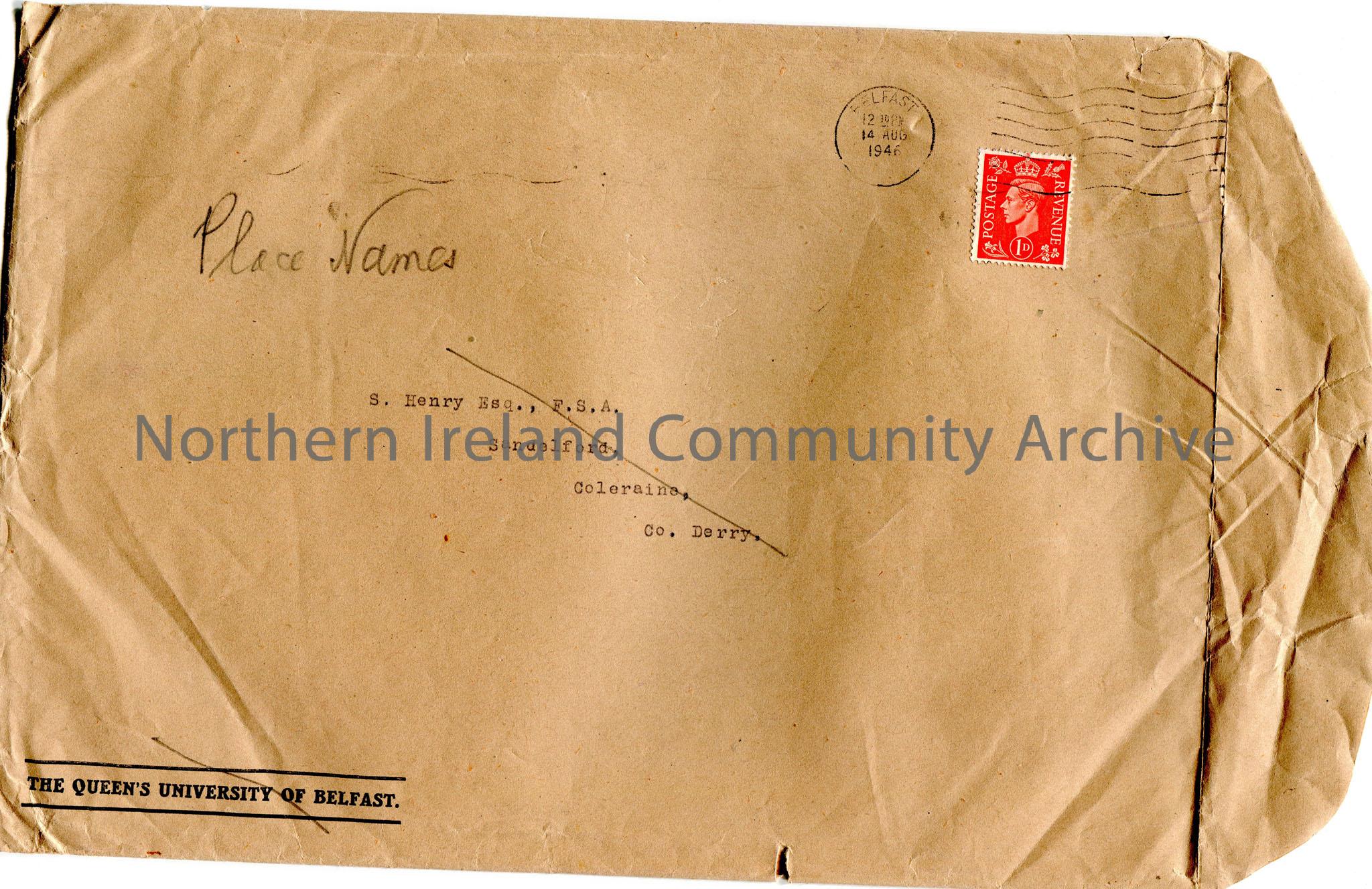 Brown envelope. 'Place Names' handwritten in pencil on front. Postmarked Belfast 14 Aug 1946. Red King George VI stamp. S. Henry Esp., F.S.A, Sandelford, Coleraine, Co.Derry scored out on front. The Queen's University of Belfast on bottom left corner also scored out.