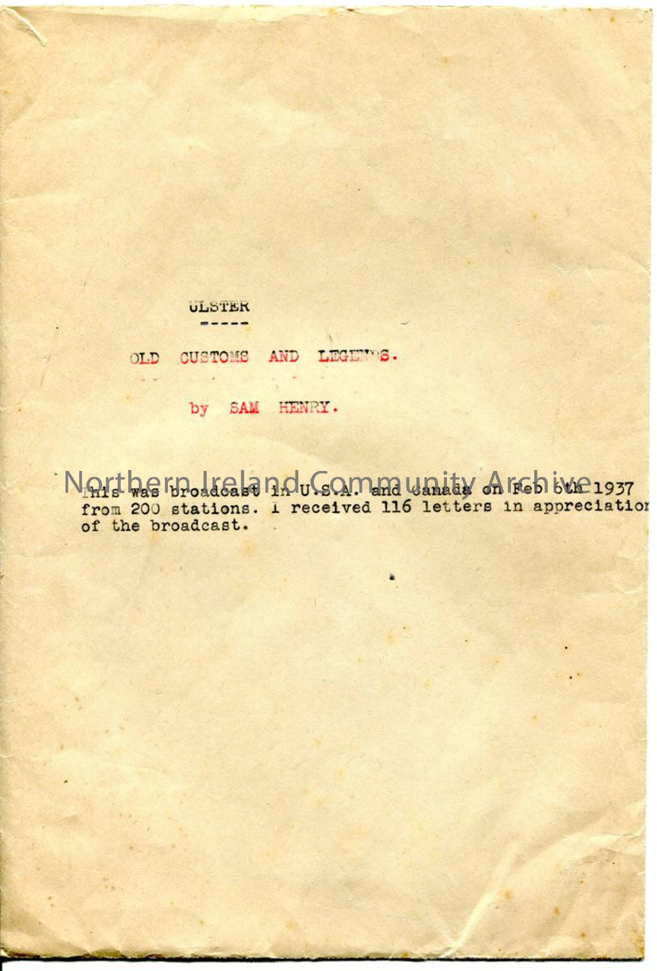 Brown envelope with typed heading 'Ulster Old Customs and Legends' and information - from broadcast in USA and Canada, received 116 letters of appreciation.