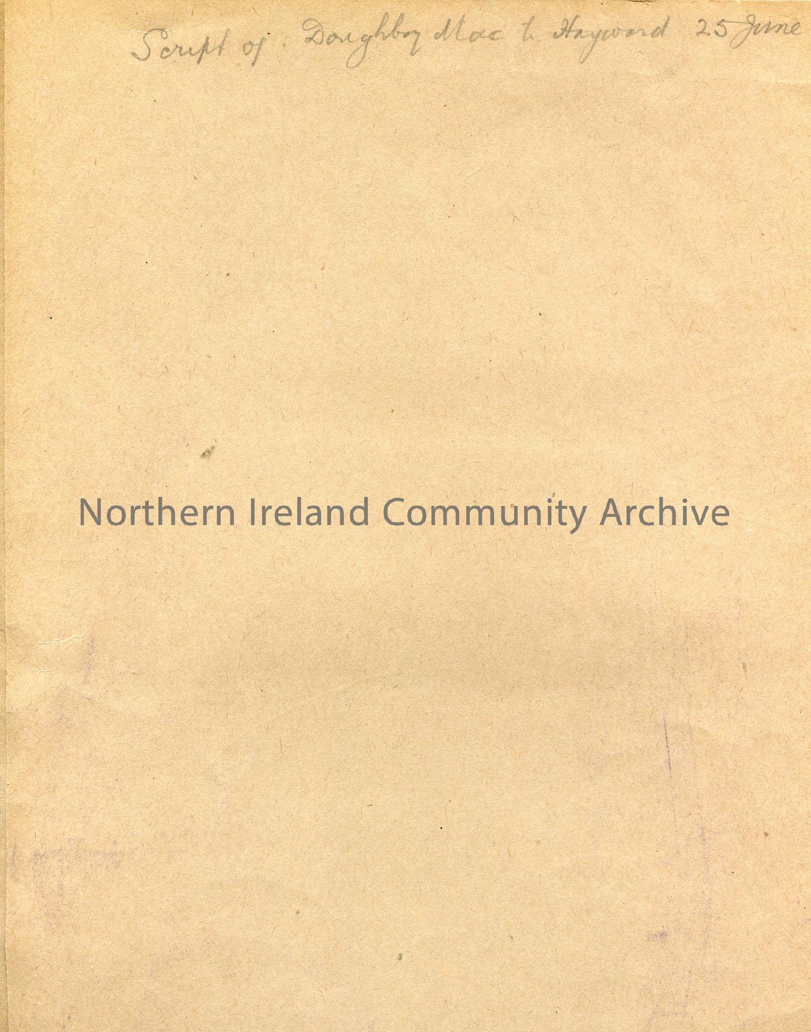 Brown folder. "A Yank in Ulster...Doughboy Mac" written in ink on front. On inside cover it reads, "Script of Doughboy Mac, Hayward 25 June 1943".