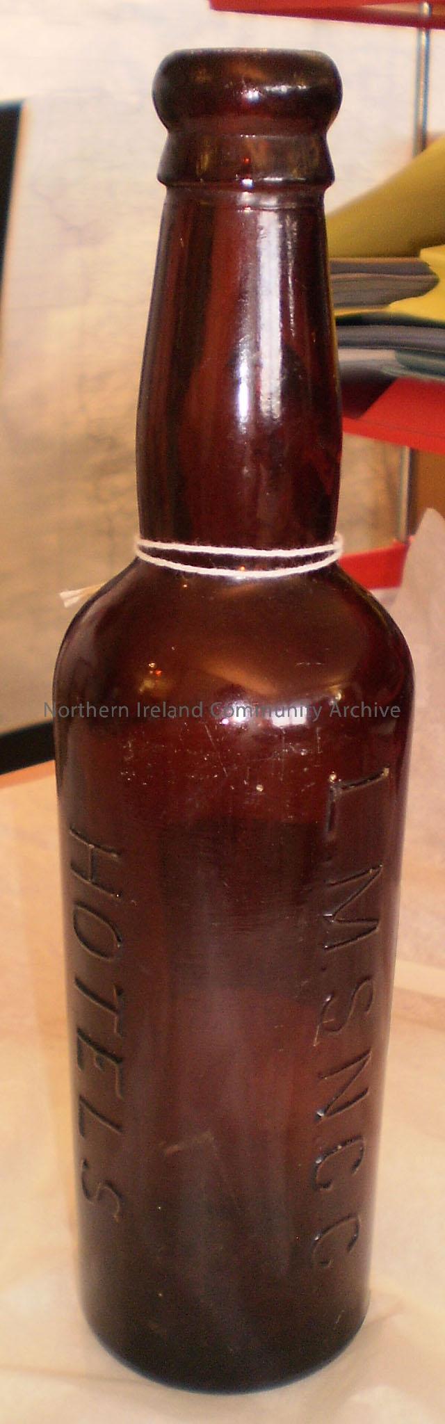 Brown glass beer bottle. Imprinted on the side is 'L.M.S N.C.C Hotels'. This refers to London Midland and Scottish Railway, Northern Counties Committee and relates to the Northern Counties Hotel, Portrush. Trademark on the base and a number '2'.