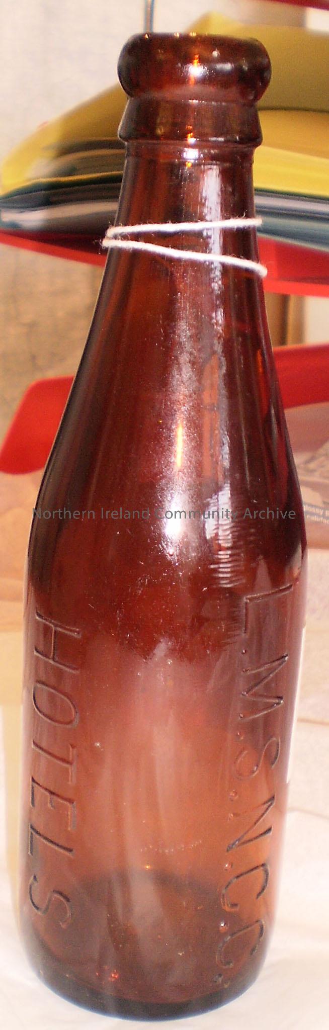 Brown glass bottle. Imprinted on the side is 'L.M.S N.C.C Hotels'. This refers to London Midland and Scottish Railway, Northern Counties Committee and relates to the Northern Counties Hotel, Portrush. Imprinted on the base is a trademark and 'A216'.