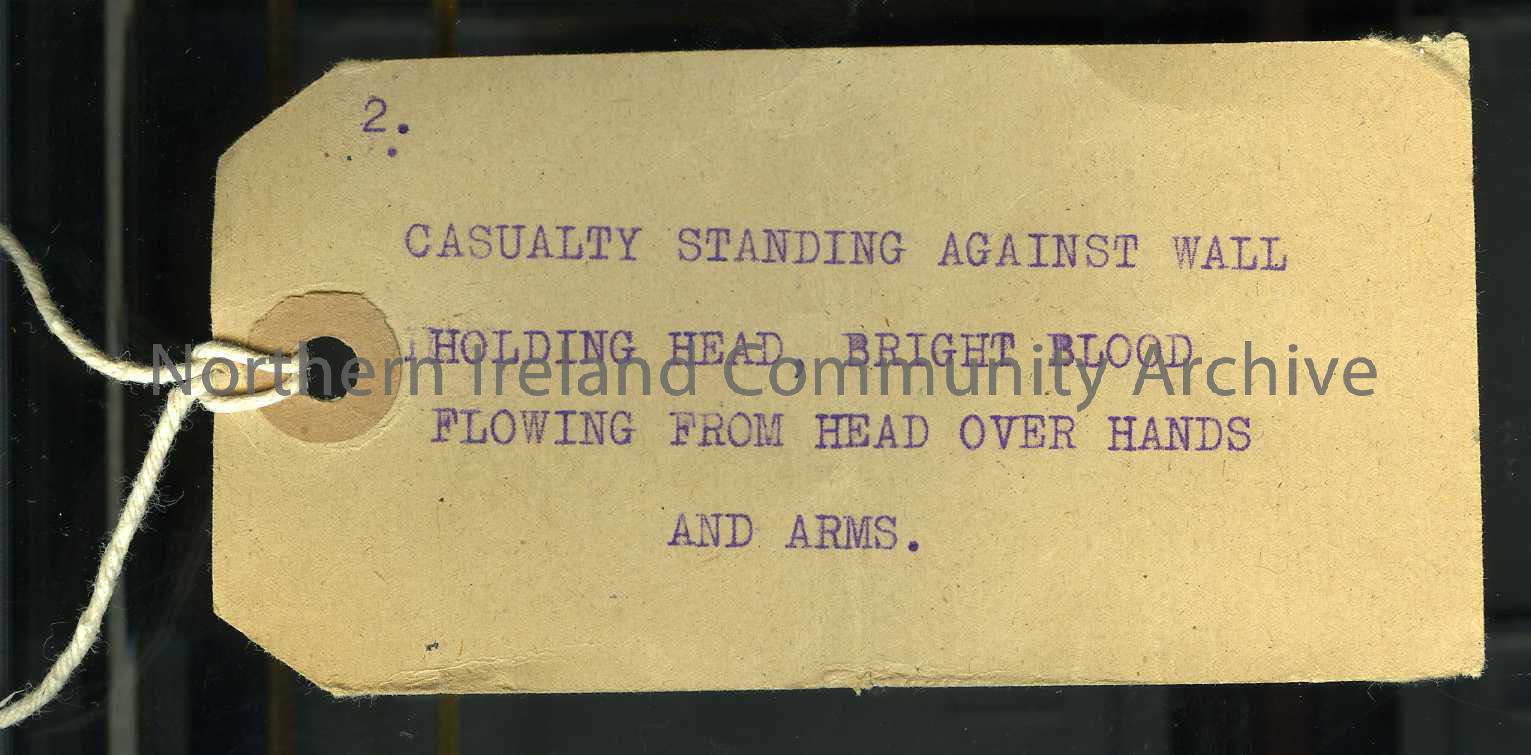 Brown labels which were attached to “casualties” during a First Aid Civil Defence excercise held in Garvagh. – 121C