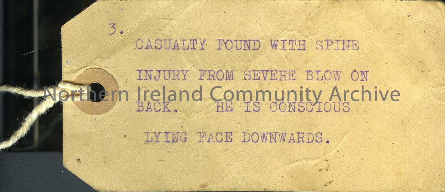 Brown labels which were attached to “casualties” during a First Aid Civil Defence excercise held in Garvagh. – 121D