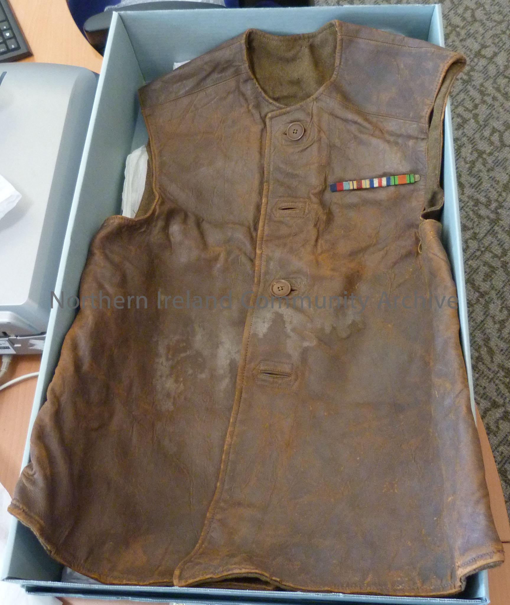 Brown leather sleeveless jacket with four buttons down the front and a multicoloured medal bar on left breast