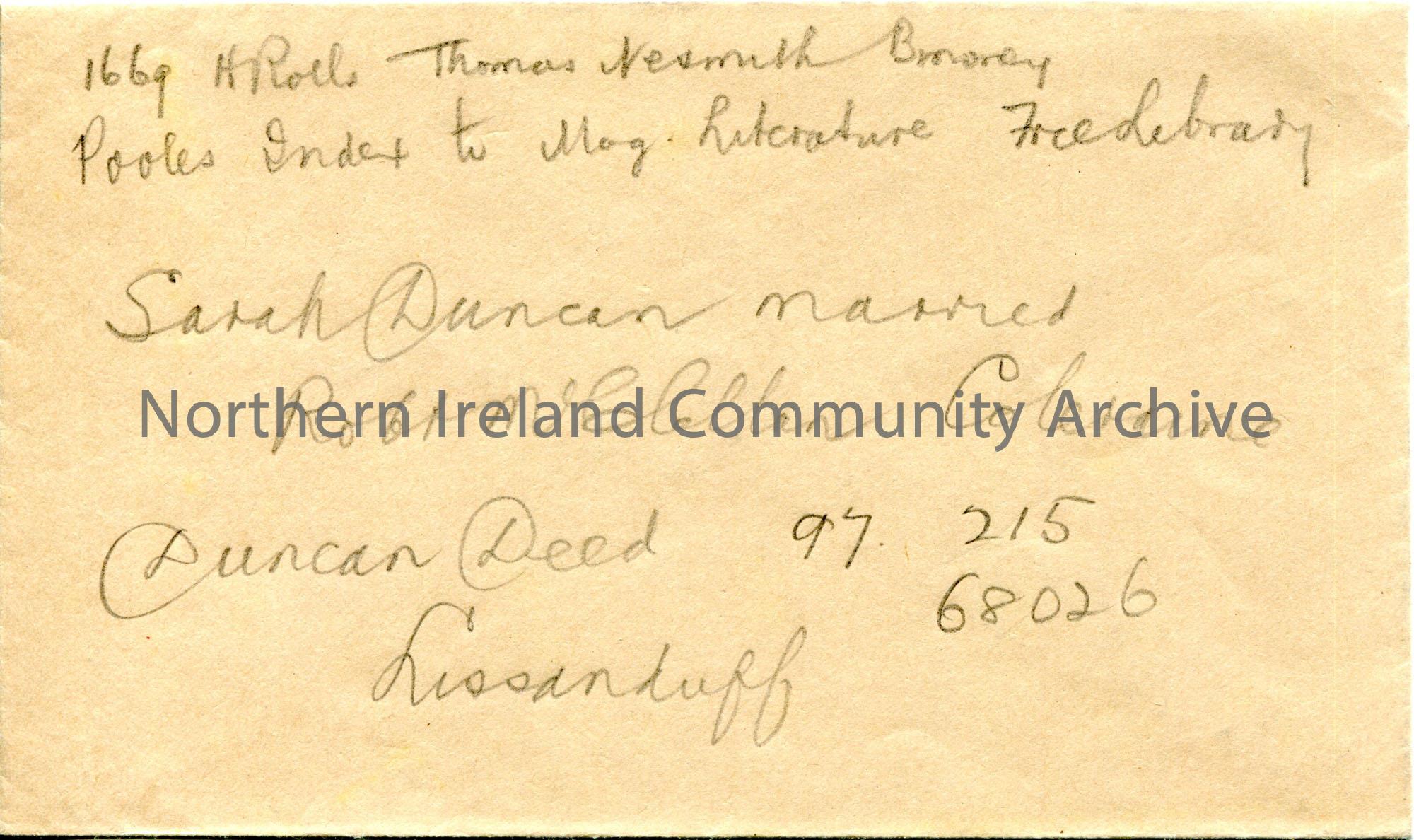 Brown manilla envelope (empty) with genealogical information of Duncan name handwritten on front in pencil. Mentions Sarah Duncan marriage to Robert McClallan, Coleraine.