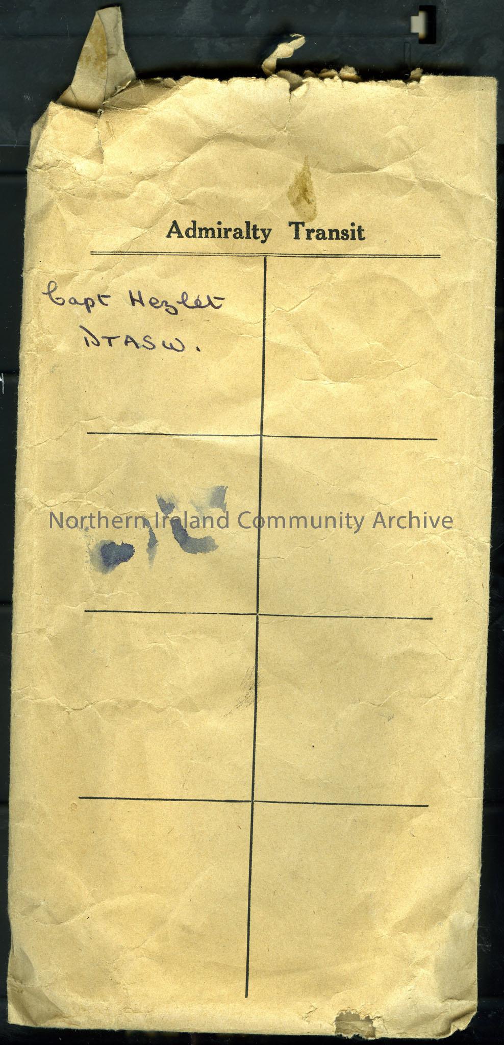 Brown paper envelope, with ‘Admiralty Transit’ printed on the front and ‘Capt. Hezlett, DTASW’ written in black ink.