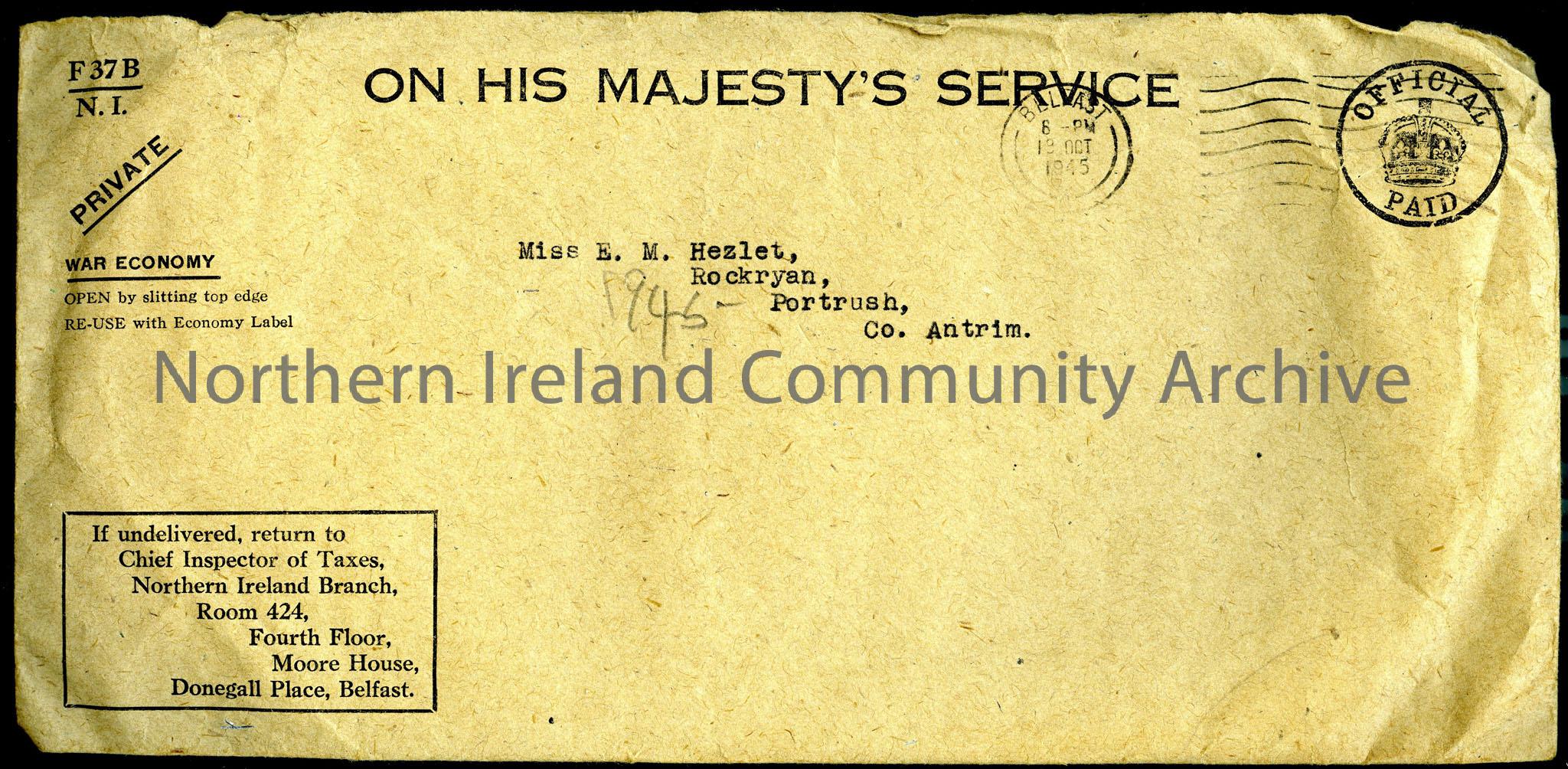 Brown paper envelope with 'On His Majesty's Service....Official Paid...War Economy' etc. stamped on front. Also, address visible: 'Miss E. M. Hezlet, Rockryan, Portrush, Co. Antrim'.