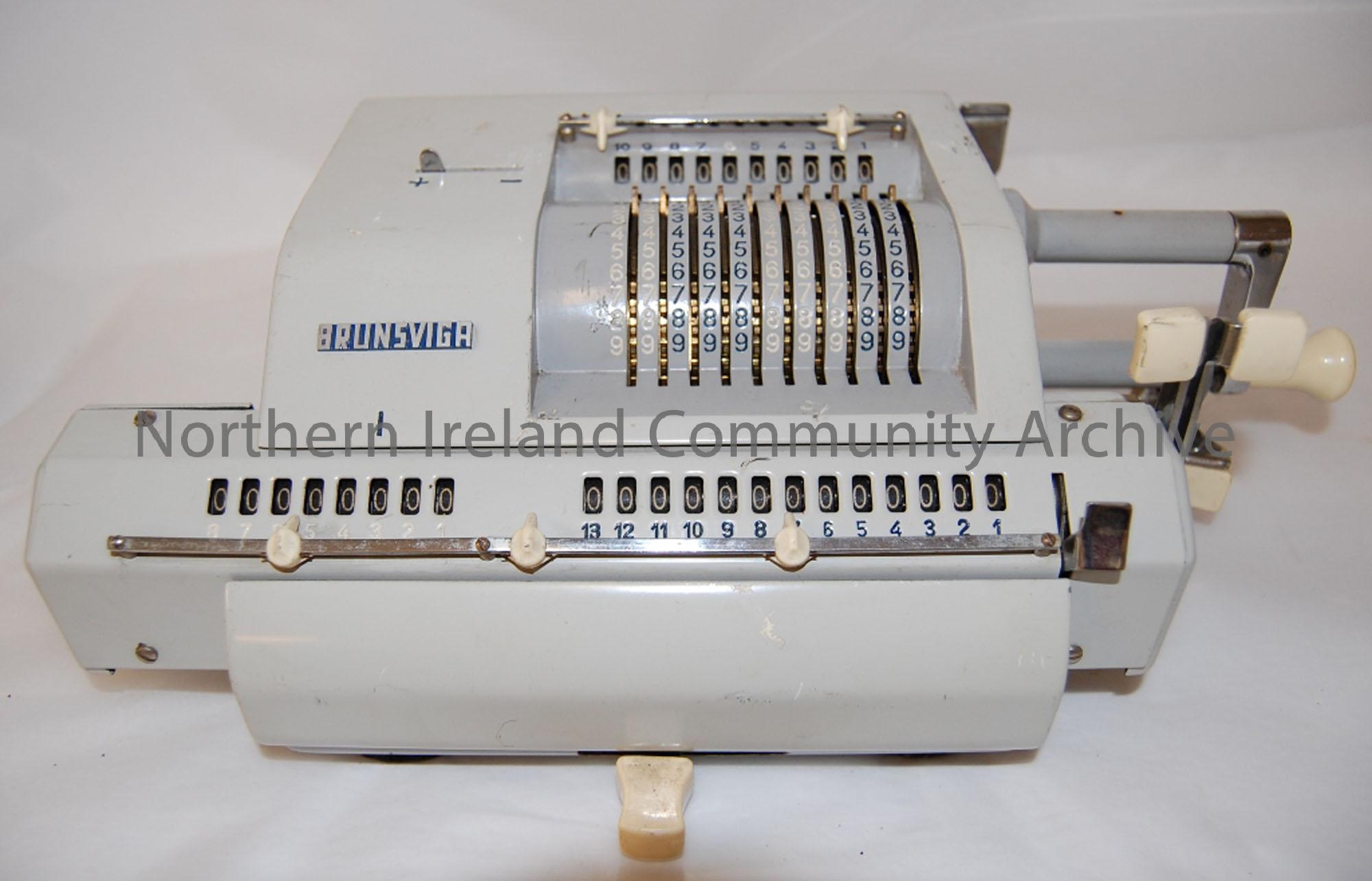 Brunsviga adding machine. Mechanical adding machine, grey metal casing with a series of levers and numbered cogs.