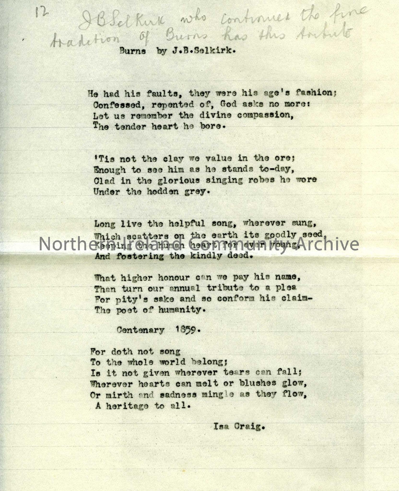 Typed copy of poem entitled Burns. Pencil notes at top. Name Isa Craig typed at end
