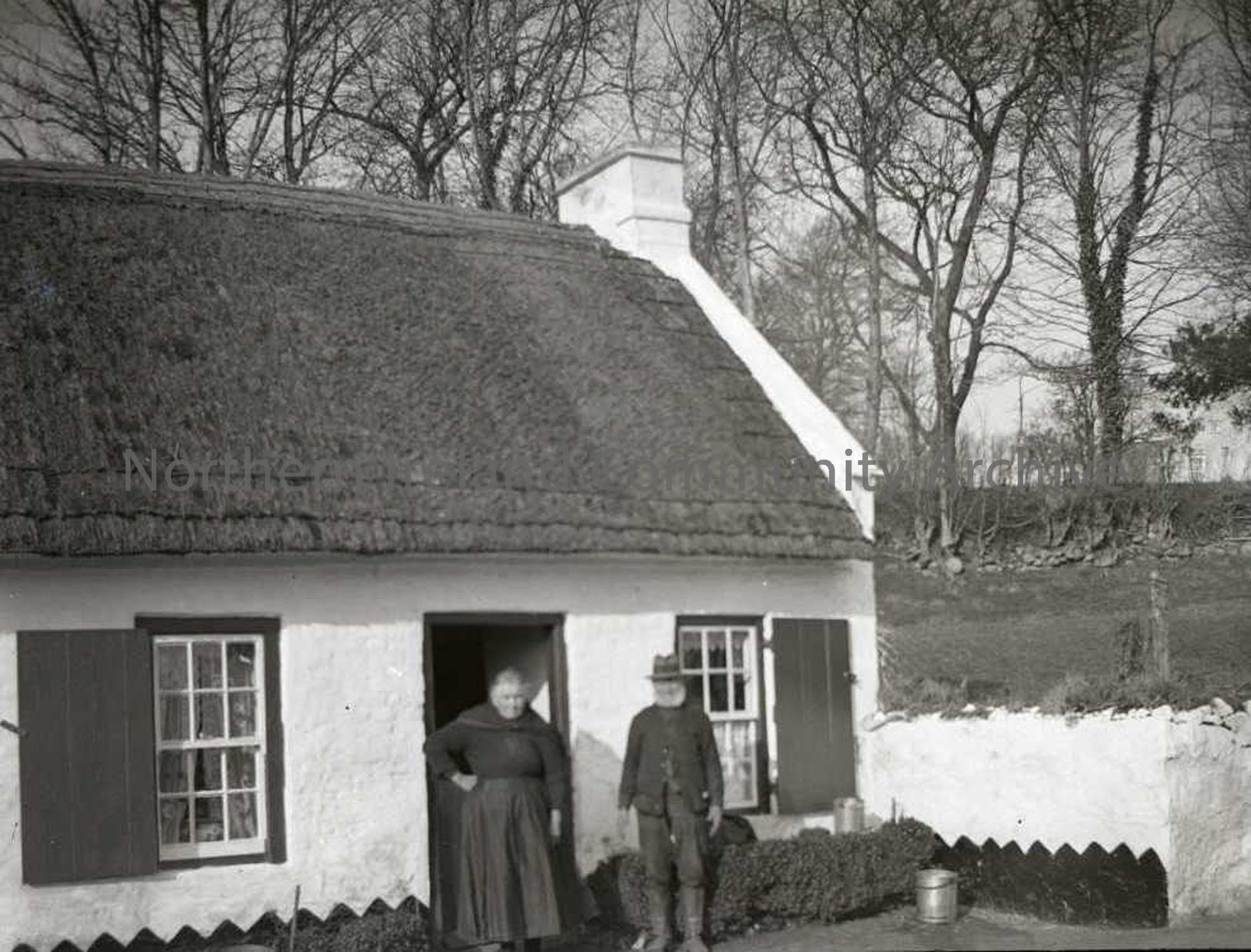 Elderly man and woman outside whitewashed thatched cottage - Burnside Cottage, Churchlands. No 89 on Nature Slides inventory. (JM - Mr W McIntyre and Jean McIntyre, son a member of Northern Constitution staff. Sam Henry's maid servant Hetty, who later became a friend of Olive Henry, was related to Mr McIntyre - he was a cousin of her grandfather). See also L:2010:1.33 and L:2010:1.58