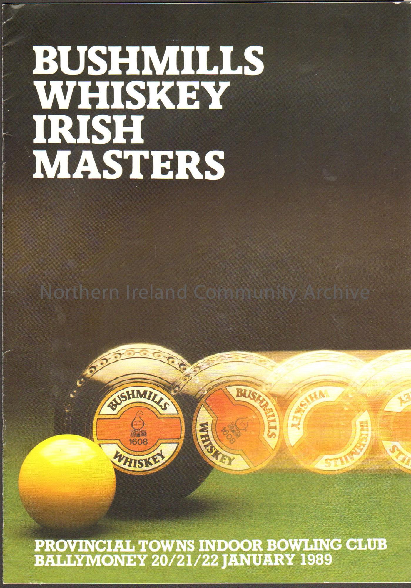 Bushmills Whiskey Irish Masters, Provincial Towns Indoor Bowling Club, Ballymoney January 1989. Black cover with a bowl rolling and a yellow jack on a green surface