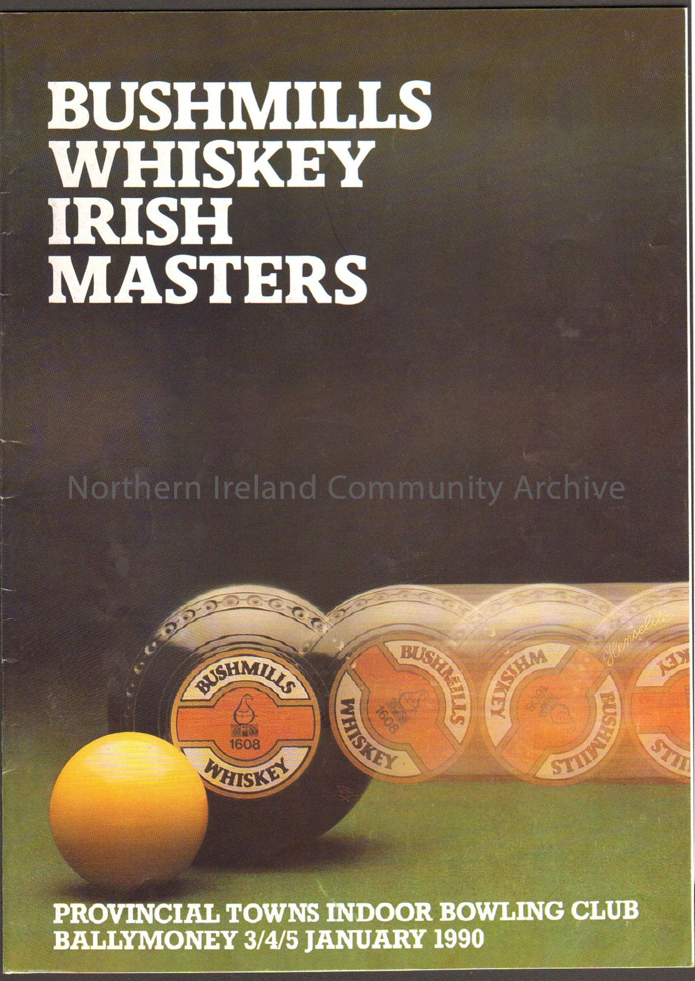 Bushmills Whiskey Irish Masters, Provincial Towns Indoor Bowling Club, Ballymoney January 1990. Black cover with a bowl rolling and a yellow jack on a green surface