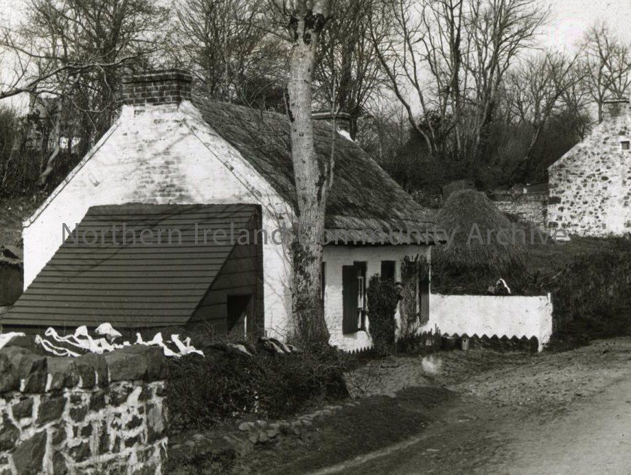 View of white thatched cottage from road front - Buskin Burn. Burnside, Churchlands area of Coleraine - see also same cottage with inhabitants at L:2010:1.417 and also L:2010:1.58