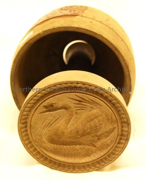 Butter print with ""Swan"" design- Has label. Dimensions: Diam. of base: 9.4cm. Handle diam: 3cm. Height: 16". Courtesy of Ballycastle Museum.
