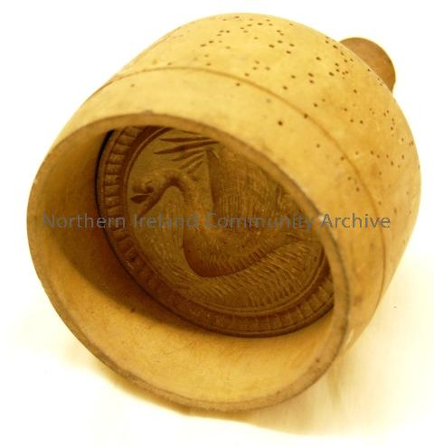 Butter print with ""Swan"" design. Dimensions: Diam. of base: 9.4cm. Handle diam: 3cm. Height: 16". Courtesy of Ballycastle Museum.