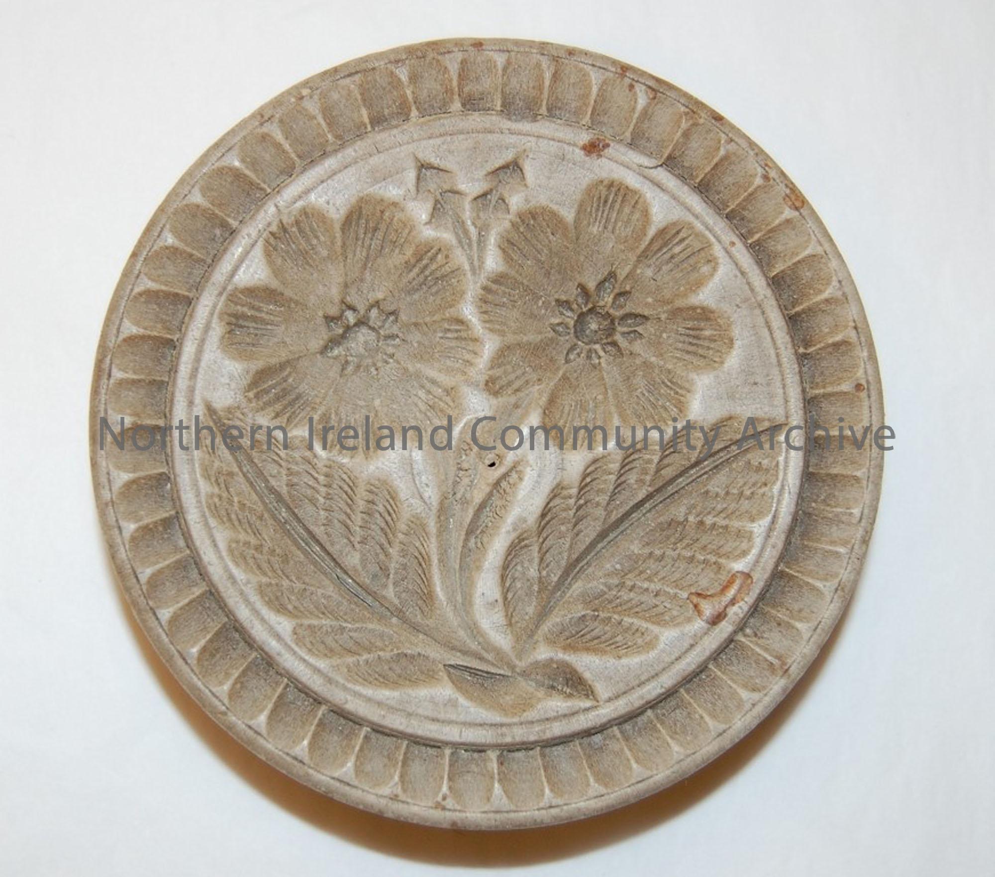 butter stamp imprinted with two flowers and ridged edges, used for pressing butter into shapes