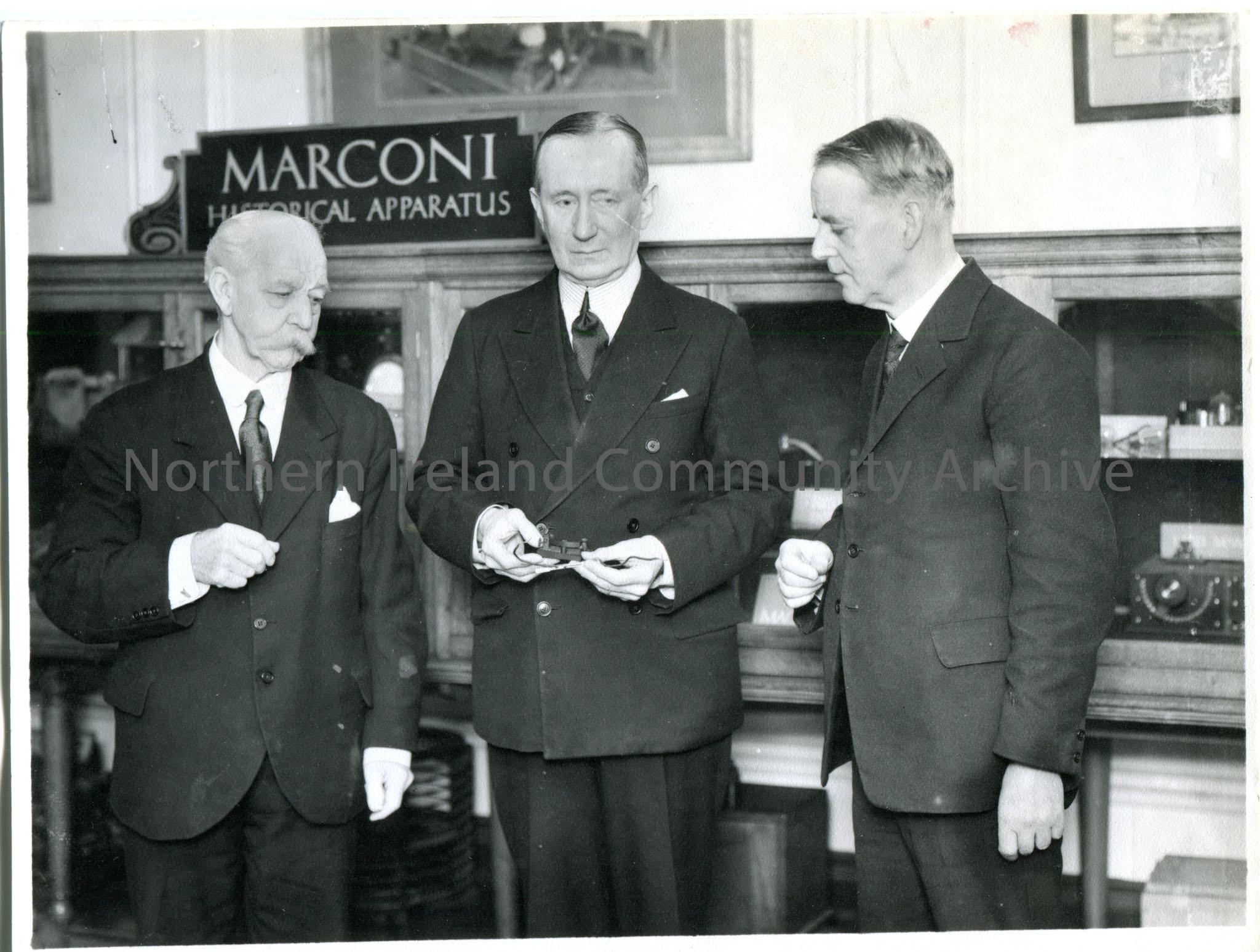 b/w photograph - Marconi (centre), Kemp (left), and Paget (right) his former assistants at a reunion in 1929.