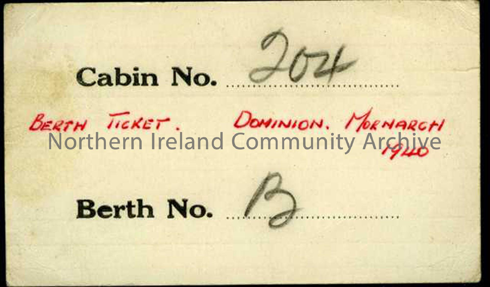 Cabin ticket for the Dominion Monarch