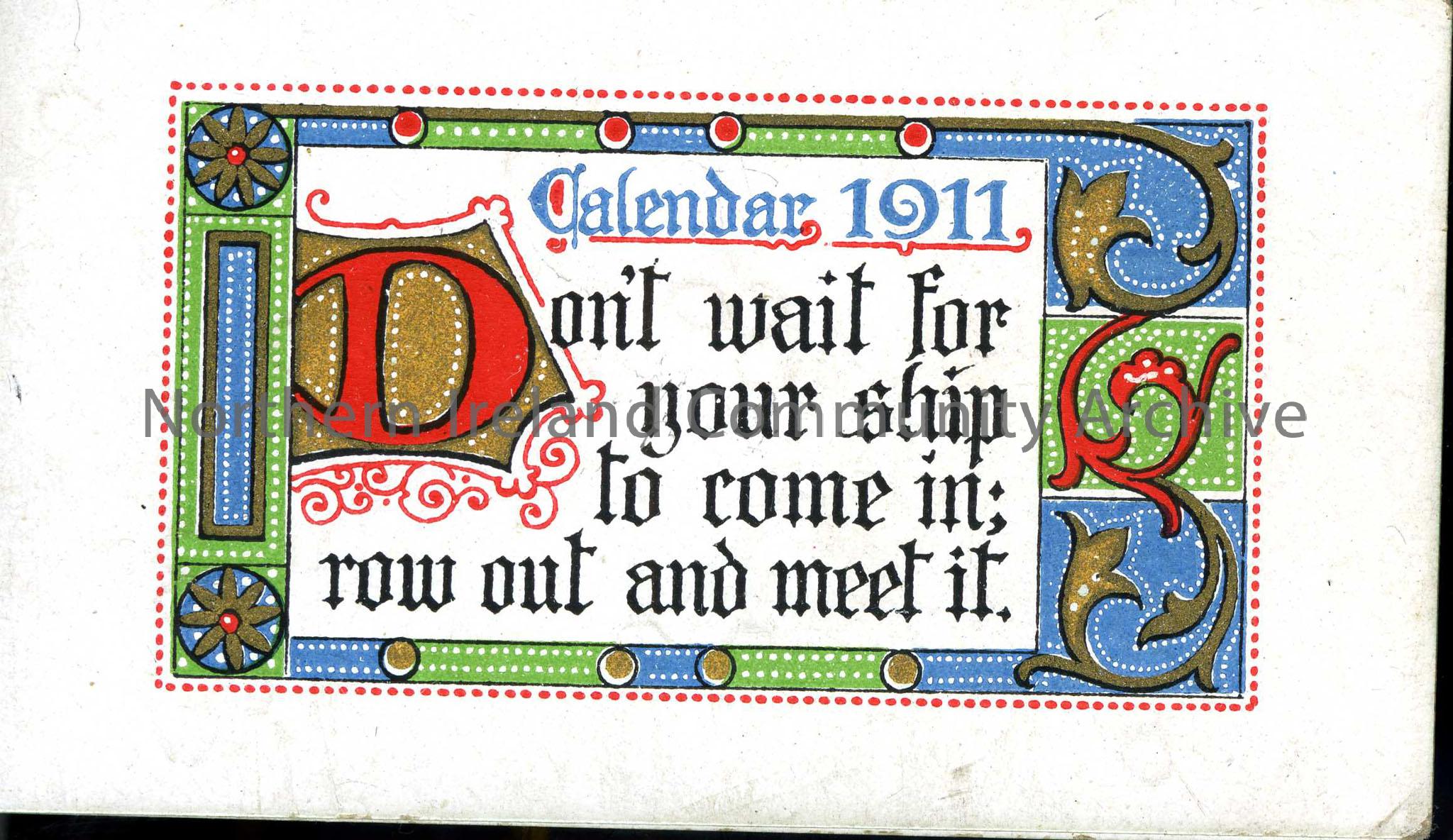 Calendar 1911 with motto. “Don’t wait for your ship to come in; row out and meet it.”