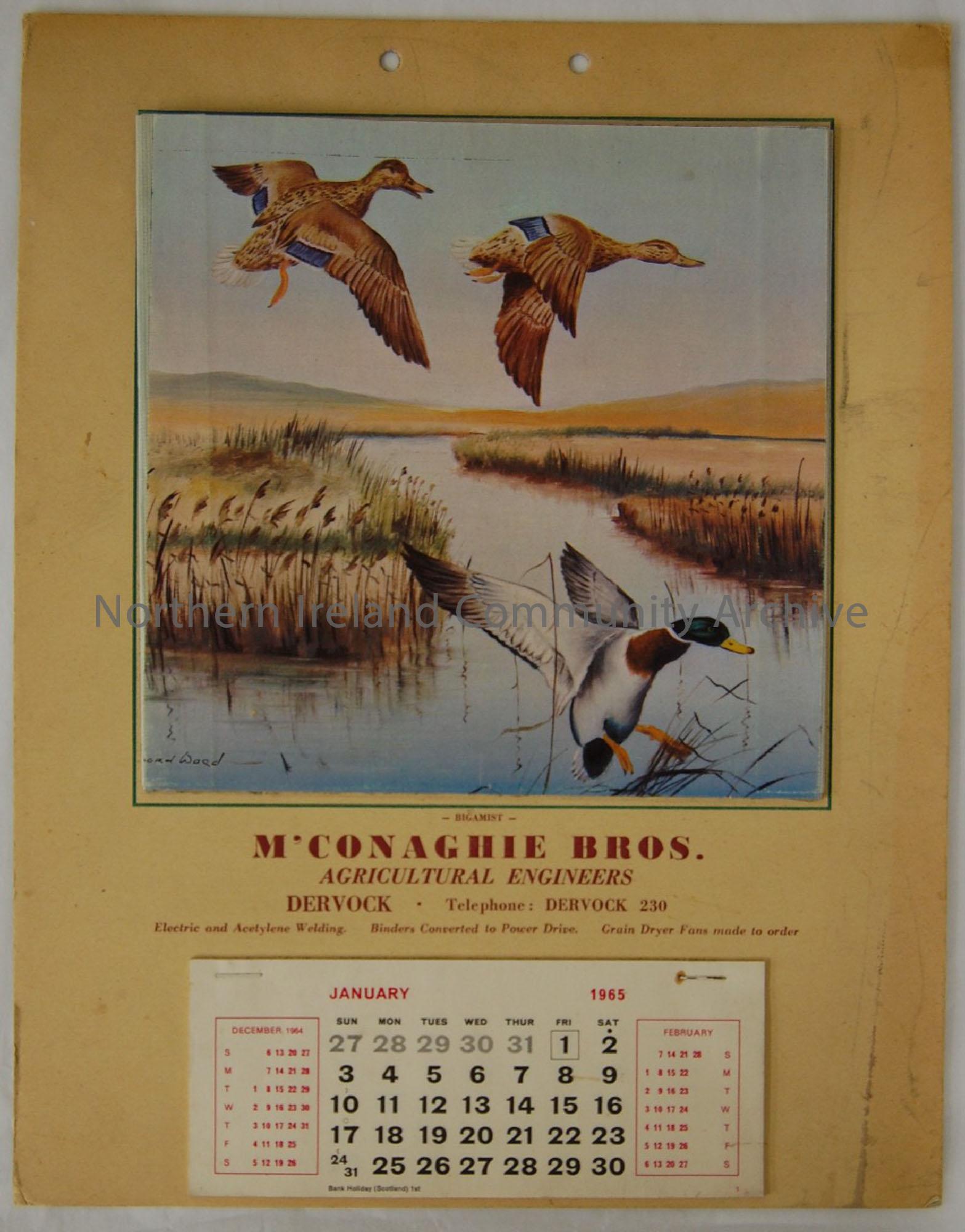 Calendar for McConaghie Bros. agricultural engineers, Dervock, 1965. Illustration of three ducks in a marsh. Calendar month sheets all still intact.