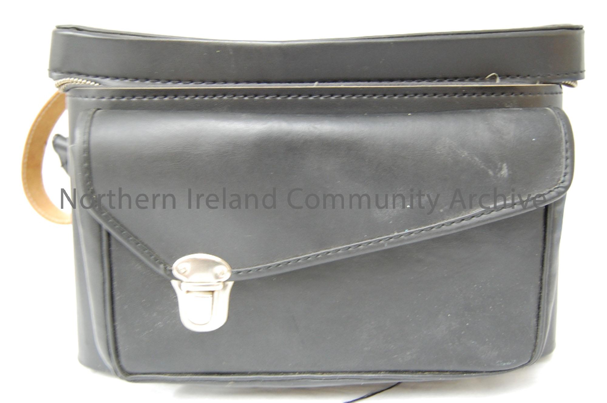 camera case for Ilford Elmo cine camera. Black plastic, with red felt interior. Zip fastened. Separte compartment on front.