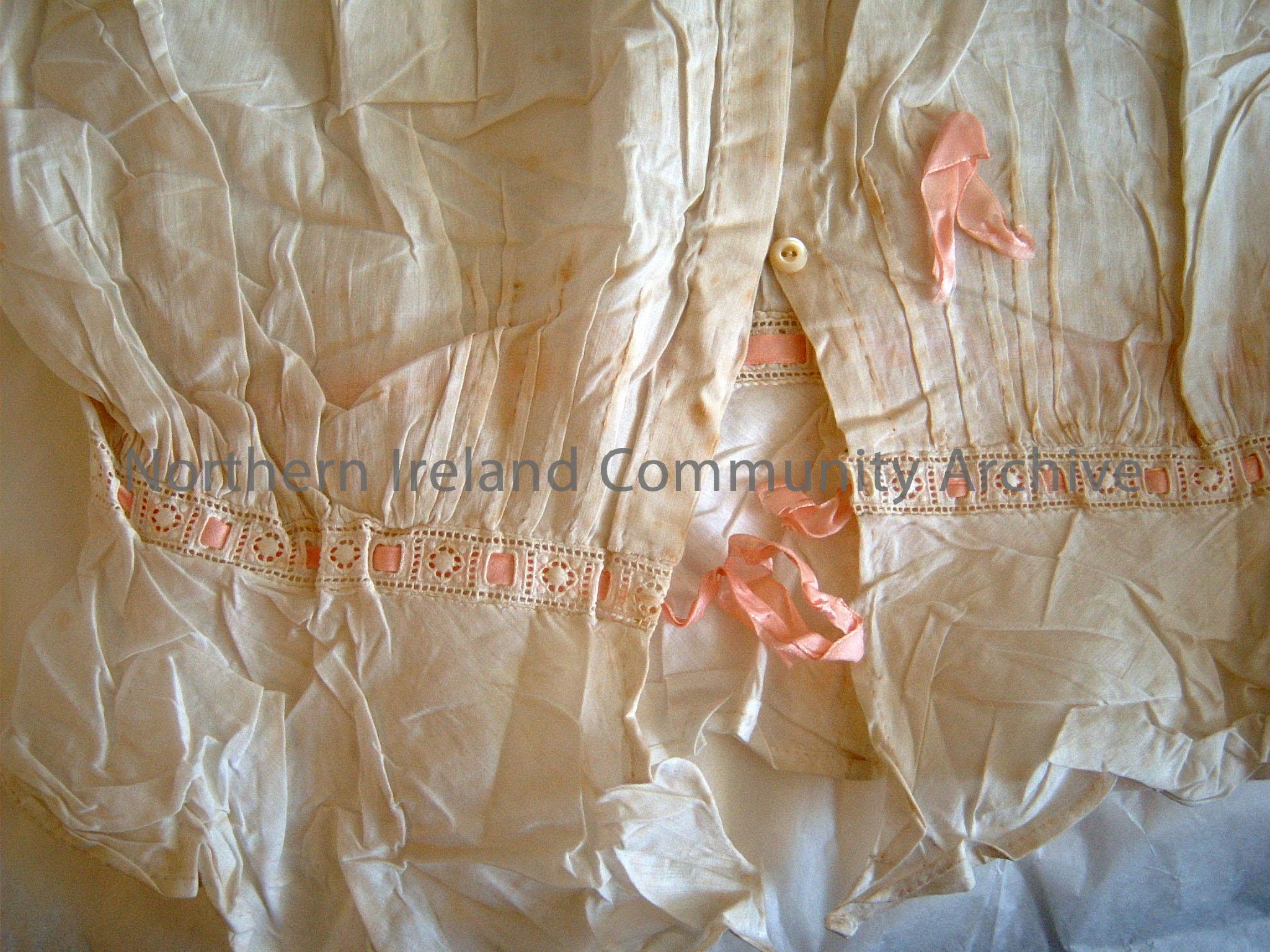 linen camisole trimmed with irish linen and pink silk satin ribbon. Decorated with embroidered birds, flowers and leaves. Decoration is Art Deco in style? This object is part of a set of two pieces which includes linen buttoned top.