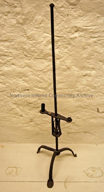 Weavers' candle stand - iron stand to hold two candles and similar in type to the traditional rush light candle holder. The weaver needed good light at the proper height and the weavers candle stand could be adjusted to any height up to four feet. Courtesy of Ballycastle Museum.