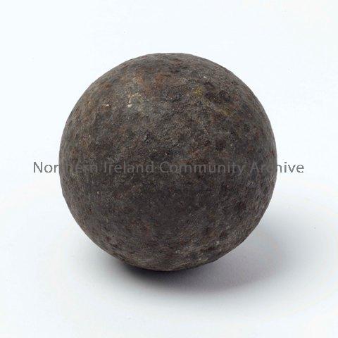 This is an example of a canon ball that would have been used in the siege of Coleraine in 1641. A canon ball like this, hit St Patrick's Church.