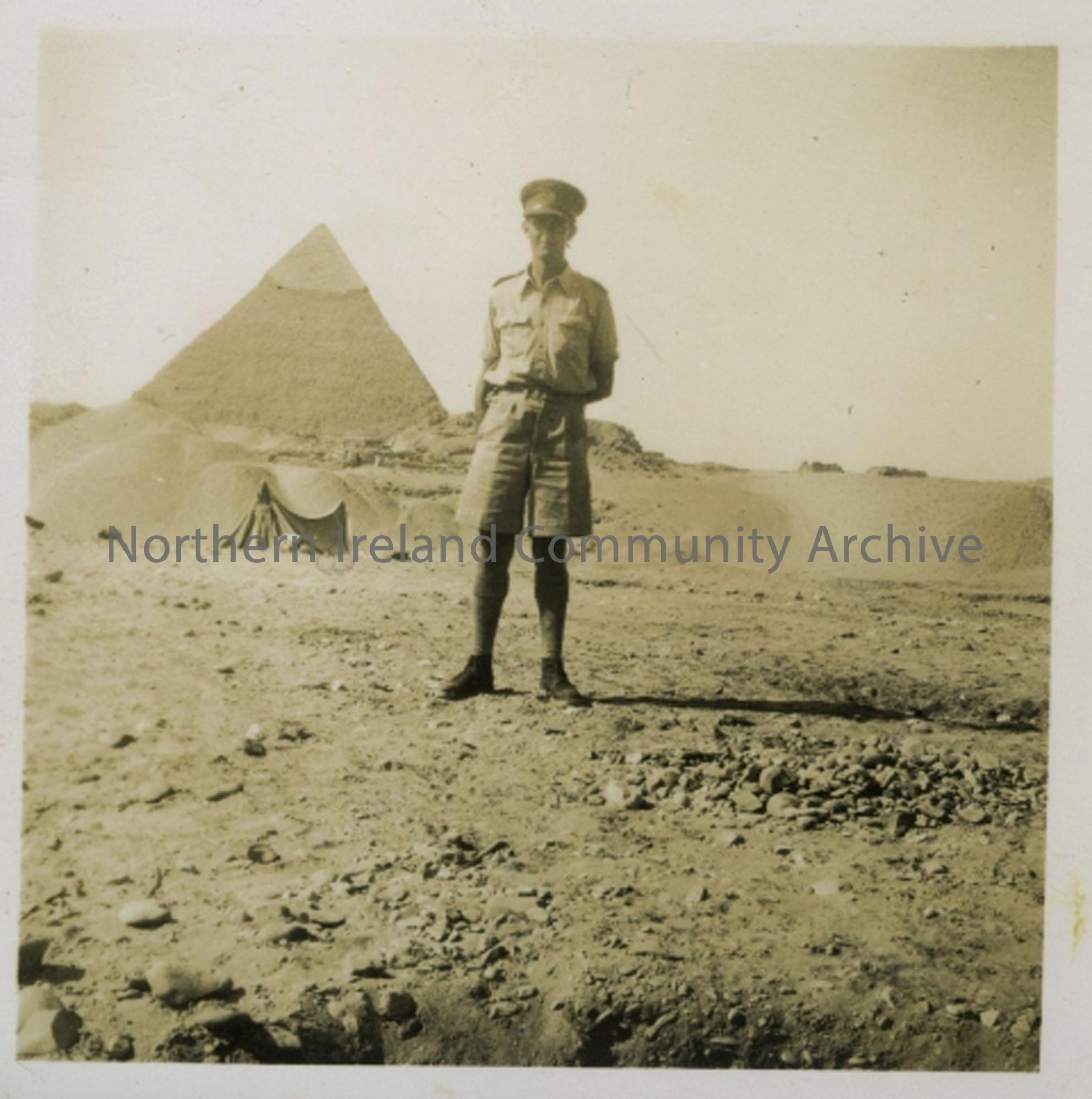 Captain R Gage standing in front of a tent and pyramid in Egypt.