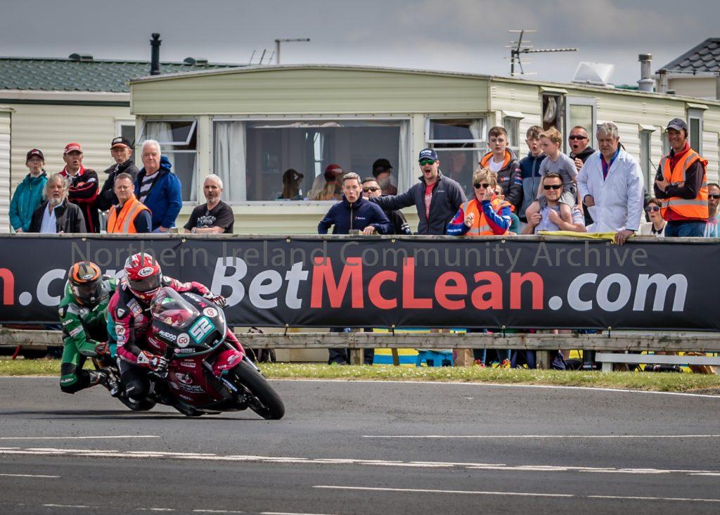 Juniper Hill Chicane. Spectators look on anxiously as Joey Thompson (74) on his ILR M Coverdale machine almost collides with James Cowton (52) on his McAdoo Kawasaki Racing machine in the Supertwin Race, by Raymond Ussher (19/05/18).