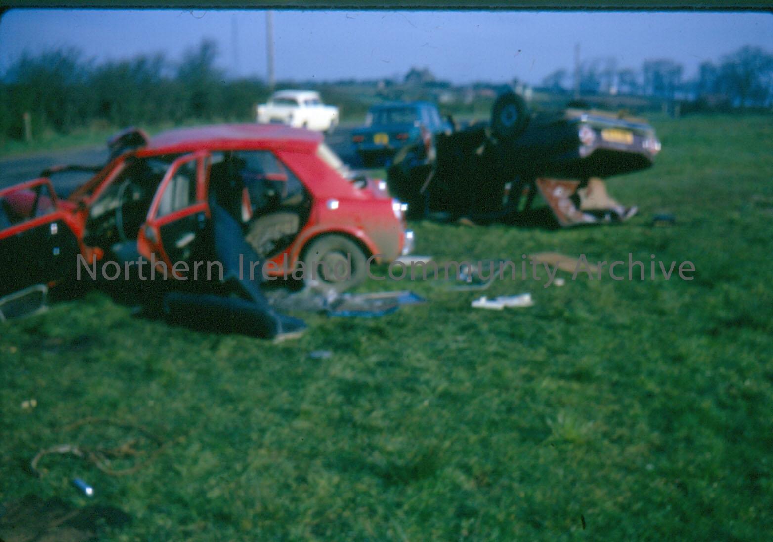 Slide depicting car crash on the Portrush Road, May 1971. Slide numbered 34 and dated May 1971